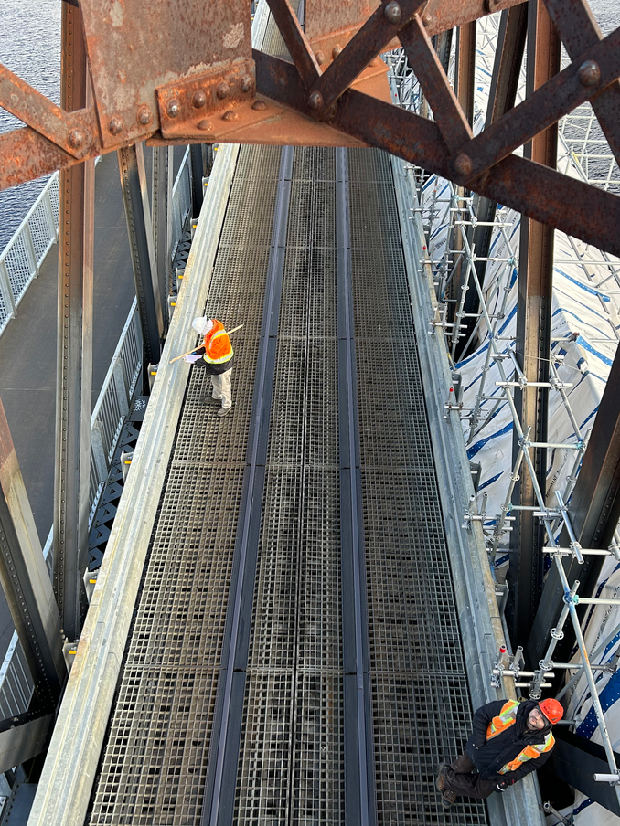 The project involves a railway bridge that has been converted for public transit use. The unique challenges presented by this retrofit required a particular attention to detail for the decking.